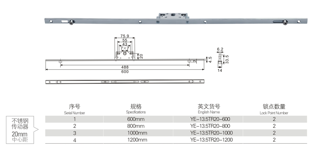 20 mm centre distance of stainless steel drive